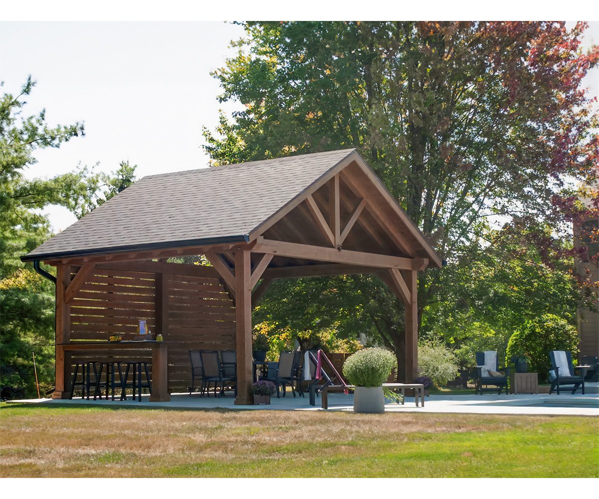 The Timber Retreat boasts a classic pavilion design. Its open gable allows you to get a full view of the rich timbers and their unique joinery from both inside and outside. A stone wall upgrade can add another dimension of luxury to the Timber Retreat.